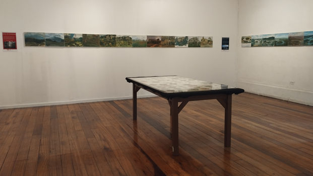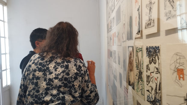 Se presenta una muestra de 2 proyectos realizados al interior de los talleres de grabado titulados DISPOSITIVOS DE LECTURA y APUNTES COTIDIANOS, además de contar con obras en donación, entregadas a la sala de exposiciones por el Maestro Gustavo Sanabria, después de su retiro y quien como egresado, autor de los anteriormente citados y como director de sala de exposiciones entre los años 2007 a 2013 simpatizó por apostarle a la creación colectiva entre docentes del área de grabado (Maestros Ferney Shambo y Maestro Ángel Alfaro) y estudiantes de los diferentes niveles de las asignaturas propias a los talleres.